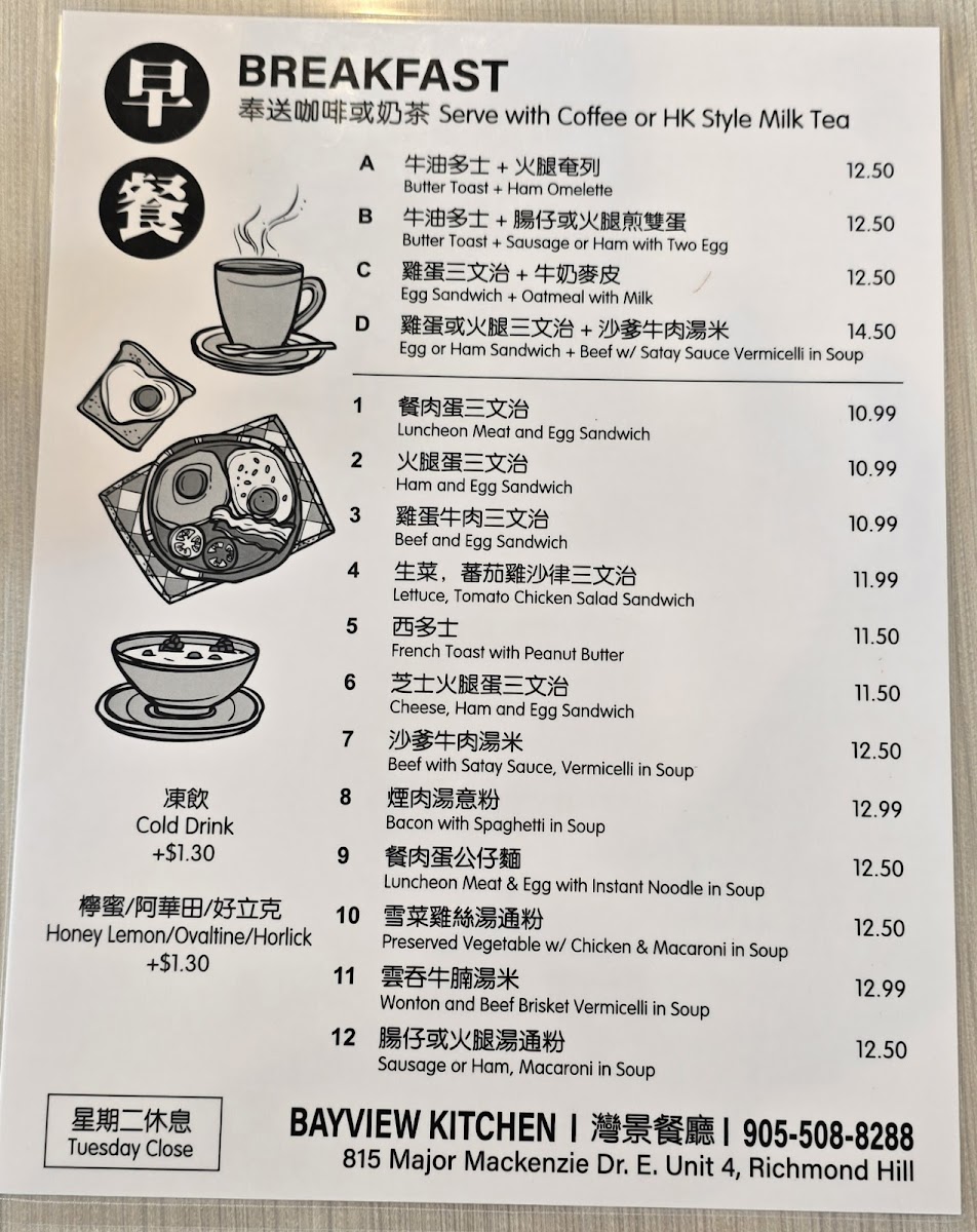 Bayview Kitchen's menu offers a comforting blend of Cantonese and classic Hong Kong-style café dishes, presenting a variety of simple yet satisfying options. The menu is well suited for casual meals throughout the day, whether you're stopping by for a cozy breakfast featuring buttery toast and ham omelettes, or enjoying a leisurely lunch or dinner with heartier plates like sweet and sour pork rice or XO beef fried noodles.
